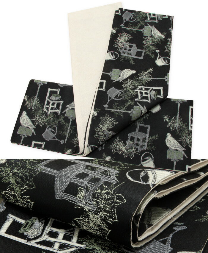 半幅帯 帯 ひさかたろまん *リバーシブル半幅帯* 黒×アイボリー*ガーデン* 半巾帯 半幅帯 リバーシブル ひさかたろまん 鳥 蔦 浴衣